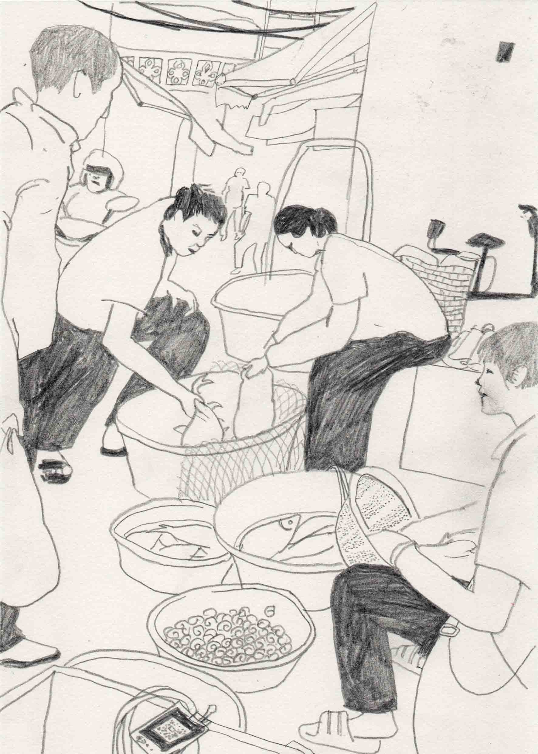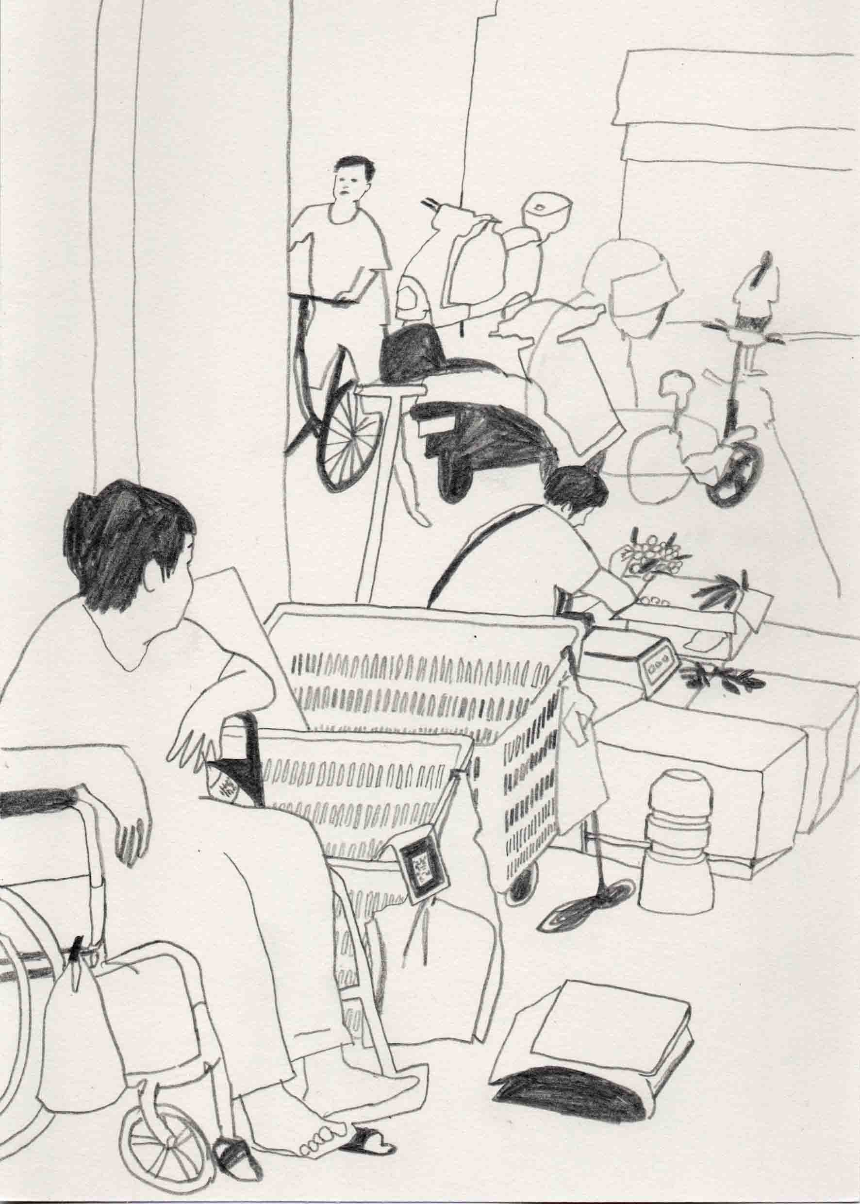 This series was developed during the residency at Dongfeng Community, Ronggui, as part of the Drifting Lands residency generously sponsored by HE Interaction. It includes a collection of reportage drawings of the people and a composite architectural cross-section, documenting the research and reflections in the area. Ronggui used to the heart of the city, maintaining economic prosperity through agricultural production exports. However it has had to develop tourism to rescue the economic decline since the past decade. Scenes that capture the vibe of the past in this area have been hugely erased by ‘Internet Celebrity Economy’.